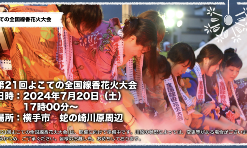 第21回 よこての全国線香花火大会 日時:2024年7月20日(土) 17:00~ 2024.7.10 第21回 よこての全国線香花火大会 日時:2024年7月20日(土) 17:00~ 場所:横手市 蛇の崎川原周辺 詳しくは下記サイトをご覧ください。 第21回よこての全国線香花火大会 Post Share Hatena LINE RSS feedly Pin it note 思い出旅館 かまだや 内覧会 前の記事 横手 音フェス(8月10〜11日) 次の記事